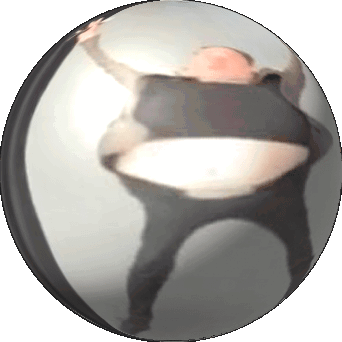 Aeth Aether Elon Musk dances happily inside a distorted spherical orb, spinning and jumping with joy.