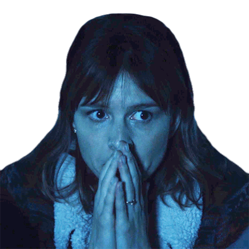 Kristen Bouchard looks around nervously, hands clasped in fear or prayer, showing deep anxiety.