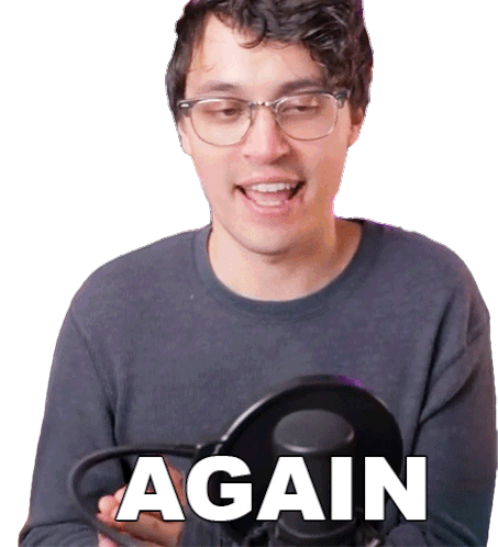 Hunter Engel, a man with glasses, smiles while holding a microphone with the word "AGAIN" displayed on it.