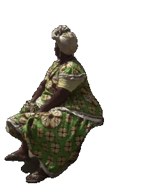 A woman in a vibrant green and gold patterned dress and headwrap sits, appearing agitated and heated, possibly fanning herself.