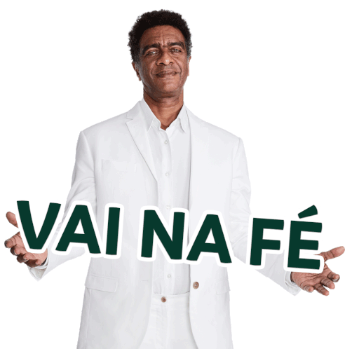 Man from Agora Lembra Suhai Seguradora encouraging with 'Vai Na Fé' message, dressed in a white suit.