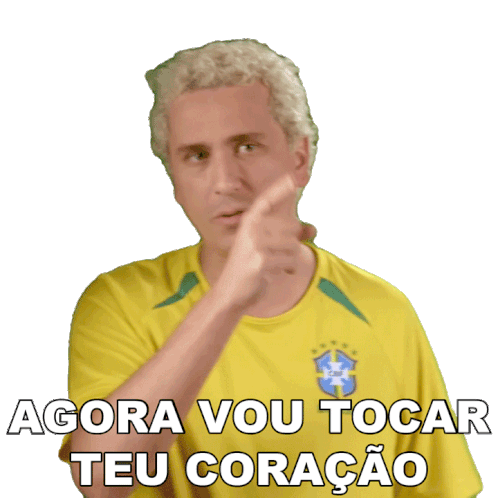 Rafael Portugal, wearing a Brazil jersey, gestures while saying 'Agora Vou Tocar Seu Coração' (Now I will touch your heart).
