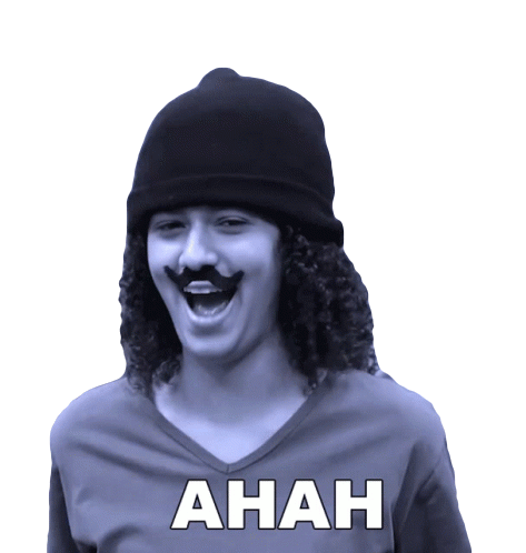 A person with a fake mustache and beanie laughs heartily, with 'AHAH' text. From Drelacionamentos.