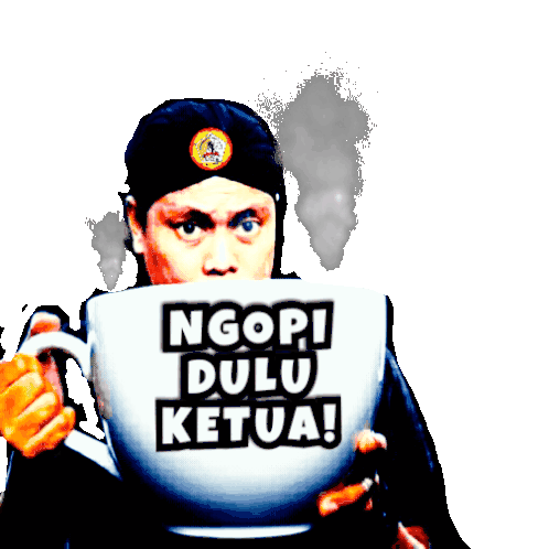 Ahmad Sulkhi Syeh Gugel holds a steaming coffee cup with the Indonesian text 'Ngopi Dulu Ketua!' (Coffee first, Chairman!).