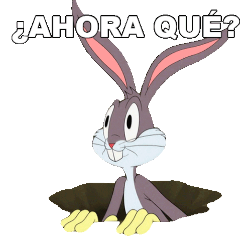 Bugs Bunny emerges from his rabbit hole, looking annoyed with the caption 'Now what?'.
