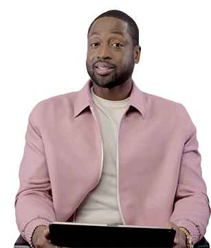 Dwyane Wade, wearing a pink jacket, makes air quotes with his fingers, showing a playful expression.