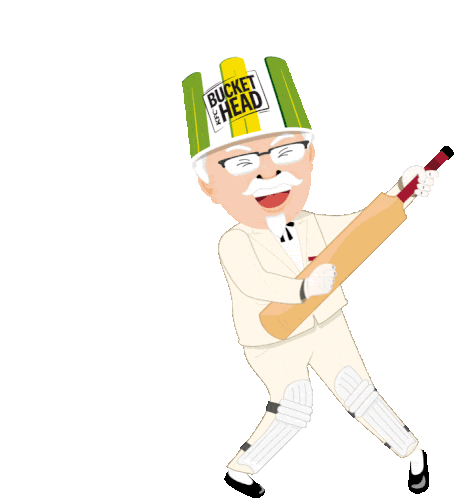 Colonel Sanders, wearing a KFC Bucket Head hat and cricket gear, enthusiastically swings a cricket bat with a joyful smile.
