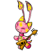 Aisha from Neopets, the pink cat-like creature, happily plays a small brown guitar, eyes closed in enjoyment.