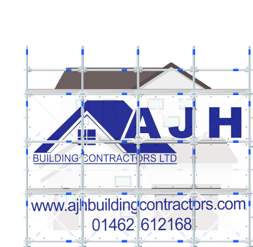 AJH Building Contractors Ltd banner on scaffolding, announcing a new project with contact details.