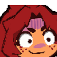 Aka Akalari, a pixel art character, looks scared and shakes with wide eyes. An expressive emote.