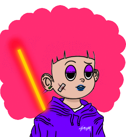 a cartoon drawing of a person with a purple hoodie that says bmm