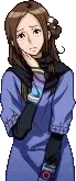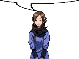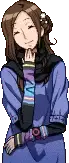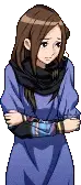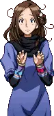 Pixel art sticker of Akane Kurashiki from Zero Escape: 999, looking worried with a black scarf and blue shirt, featuring 'eleanor' text.