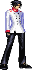 Akatsuki Blitzkampf character Akatsuki in a pixel art win pose. A man in a white jacket and black pants.