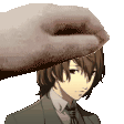 Akechi Goro from Persona 5 receives a gentle head pat, showing a moment of affection and comfort.