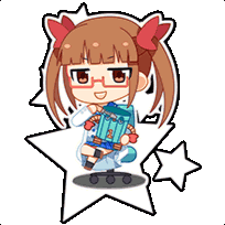 Akiha Ikebukuro, a cute chibi character with pigtails and glasses, sits on a star-shaped chair, holding a blue object.