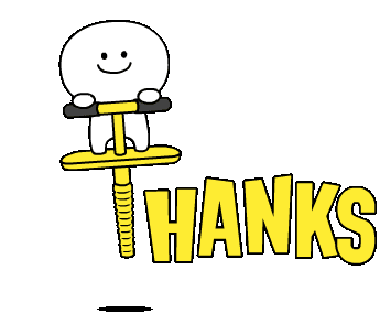 Akirambow Smile Person bounces on a pogo stick, cheerfully saying 'Thanks' with a big smile.