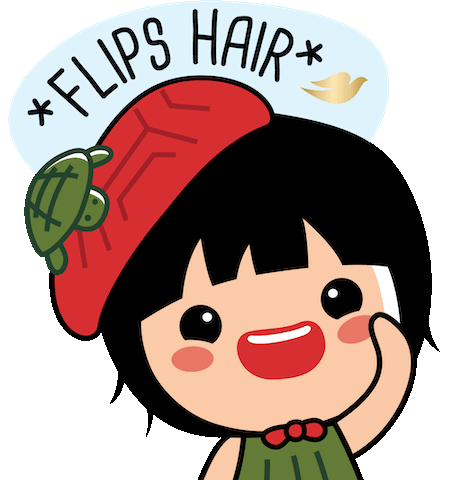 Ang Ku Kueh Girl, a charming Singaporean character, happily flips her hair with a smile, featuring a dove icon.