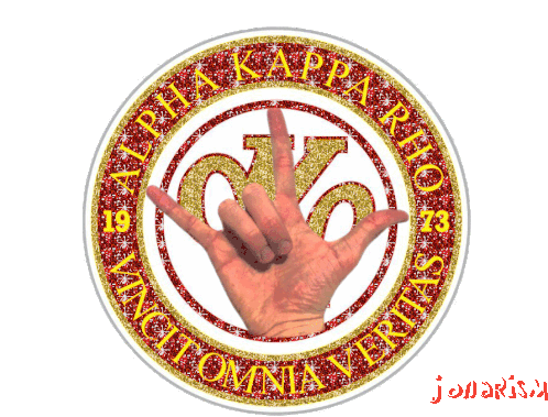 A sparkling Alpha Kappa Rho fraternity seal featuring a glittery hand making a rock sign, with "Vincit Omnia Veritas".