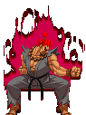 An animated pixel art sticker featuring Akuma Gouki from Street Fighter, calmly sitting on a chair.