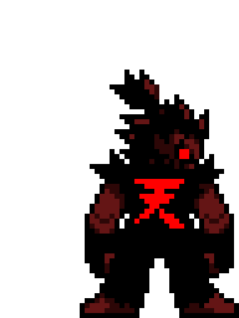 Akuma, the iconic Street Fighter character, depicted in pixel art with glowing red eyes and his signature symbol.