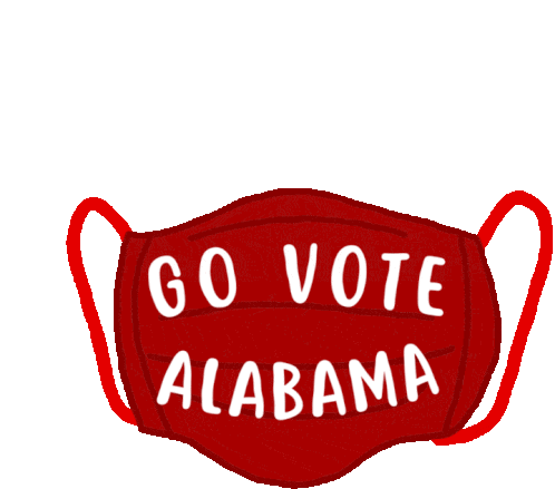 A vibrant red face mask with "GO VOTE ALABAMA" written in white, encouraging participation in elections and civic duty.