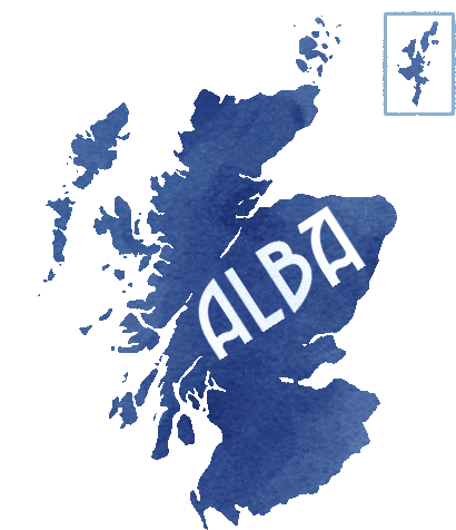 A vibrant watercolor map of Scotland, featuring 'ALBA' in Gaelic script, representing Scottish heritage.