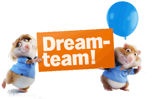Two Albert Heijn Appie hamsters hold a 'Dream-team!' sign and a blue balloon, celebrating teamwork.