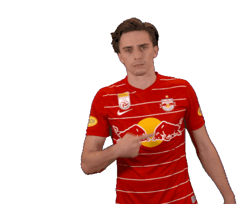 Albert Vallci, a Red Bull Salzburg player, points proudly to his team's badge on his red and white jersey.