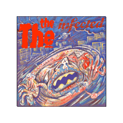 Vibrant, stylized album cover art for 'Infected' by The The, featuring a monstrous figure and city skyline.