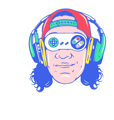 a colorful drawing of a man wearing headphones and a video game controller with alex edwards written below him