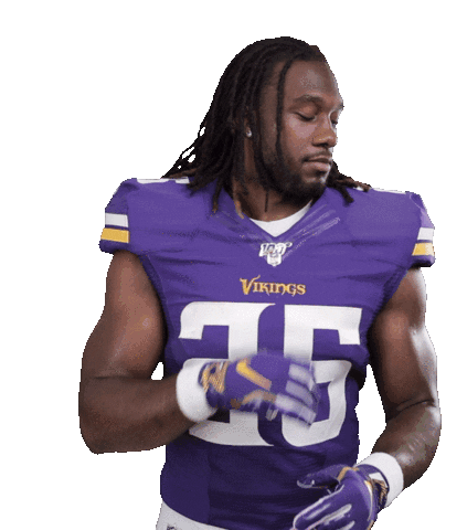 Alexander Mattison of the Minnesota Vikings performs a confident 'dusting off' gesture in his purple jersey.