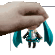 Alexmiku, a small doll with blue ears and long hair, is held by a hand in this cute pet sticker.