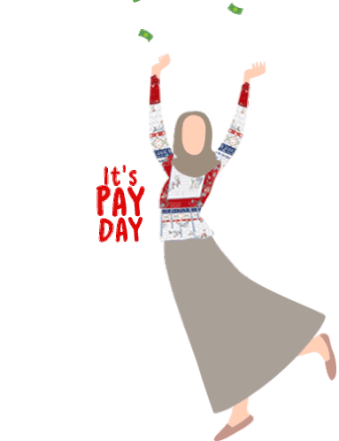 A woman wearing an Aleza Label hijab and a festive sweater celebrates as money falls from the sky, with the text 'It's PAY DAY'.