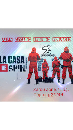 Promotional sticker for Alfa Cycling Spinning Projects, featuring 'La Casa de Spin' event with figures in red jumpsuits.
