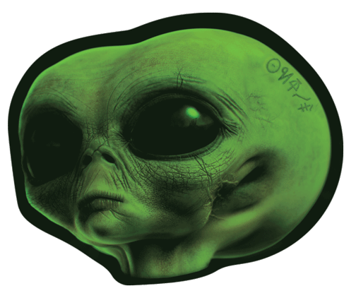 A detailed green alien head with large black eyes, featuring a classic extraterrestrial look. Perfect for sci-fi fans.