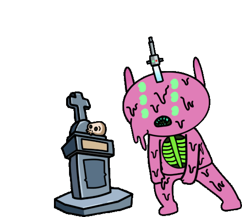 A pink Alien Fren creature with a syringe head stands by a tombstone with a skull, looking at it.