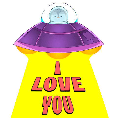 A cute Pudgy Penguin in a UFO beams down "I LOVE YOU" in a vibrant green light, perfect for expressing affection.