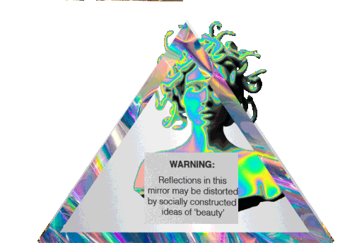 Alina Sanchez's holographic Medusa art with a warning about socially constructed beauty standards distorting reflections.