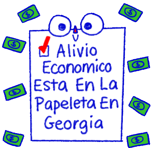 Spanish sticker promoting economic relief on the ballot in Georgia, surrounded by dollar bills and a checkmark.