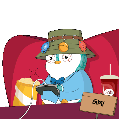 A tired penguin gamer in a hat and bow tie plays video games all night, with a 'Gm!' sign and snacks.