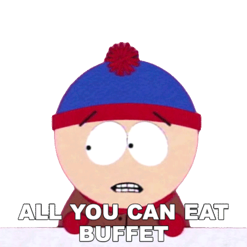Stan Marsh from South Park reacts with wide-eyed shock to an "All You Can Eat Buffet," overwhelmed by the prospect of unlimited food.