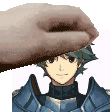 Alm from Fire Emblem Echoes receives a playful bread 'headpat' from a hand, a humorous and lighthearted moment.