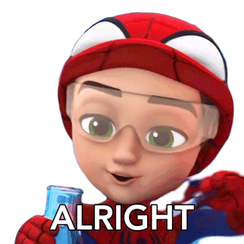 Young Peter Parker as Spider-Man from 'Spidey And His Amazing Friends', giving a cheerful 'Alright!' with a beaker.