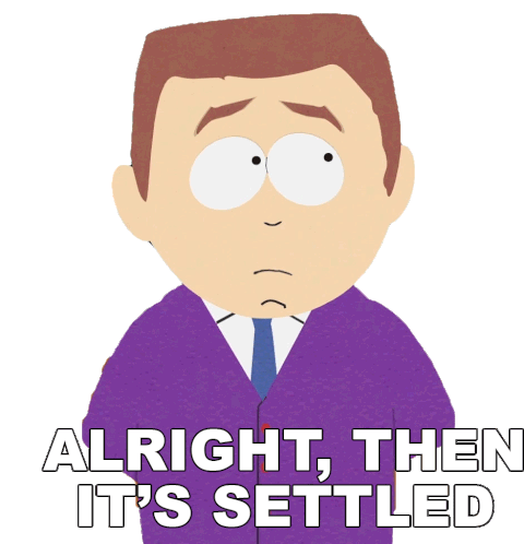 Stephen Stotch from South Park declares, 'Alright, then it's settled,' with a determined expression.