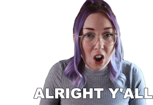 Ashnichrist, a woman with purple hair and glasses, energetically says 'Alright Y'all' to greet or address viewers.