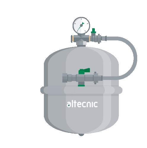 An animated sticker featuring an Altecnic expansion vessel, complete with a pressure gauge and valves, essential for heating and plumbing systems.