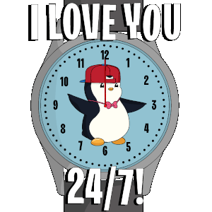 A cute penguin on a watch expresses 'I Love You 24/7', symbolizing endless affection and timeless love.