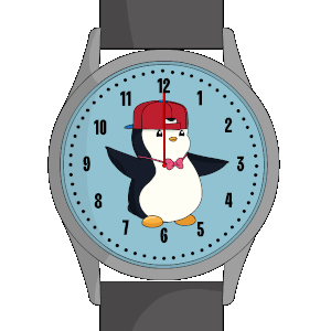 An adorable animated watch featuring a penguin with a red hat and bow tie, symbolizing timeless love.