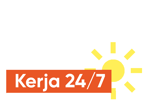 An animated sticker displaying 'Kerja 24/7' with a sun and moon, symbolizing continuous work day and night.