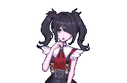 a pixel art of a girl with pigtails and a red shirt and black skirt .